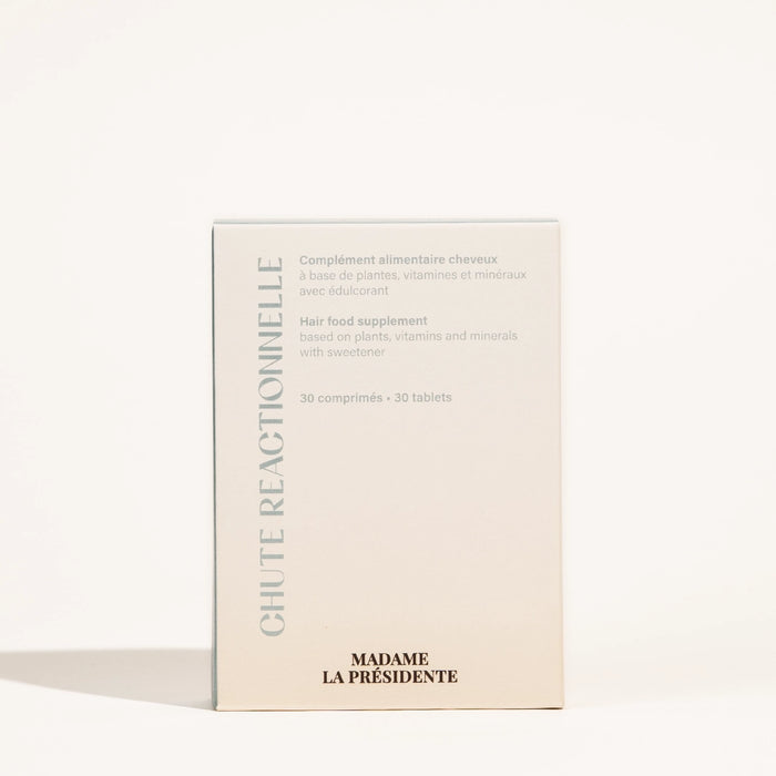 مُصنّع في مختبر، يحتوي علاج "ريأكشنال" لتساقط الشعر على شعر الزهرة، وفيتامين ب6، والمغنيسيوم، والبيوتين، والزنك. بفضل تركيبته، يُكافح علاج "ريأكشنال" لتساقط الشعر من "السيدة الرئيسة" تساقط الشعر ويُقوّي أليافه.