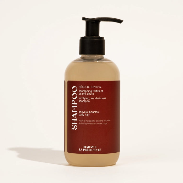 بفضل تركيبته، شامبو Resolution No. 5 المقوي والمضاد لتساقط الشعر من Madame la Présidente: يبطئ تساقط الشعر، يقوي بصيلة الشعر، يحفز النمو ، يضيف لمعانًا ويجعل الشعر ناعمًا.