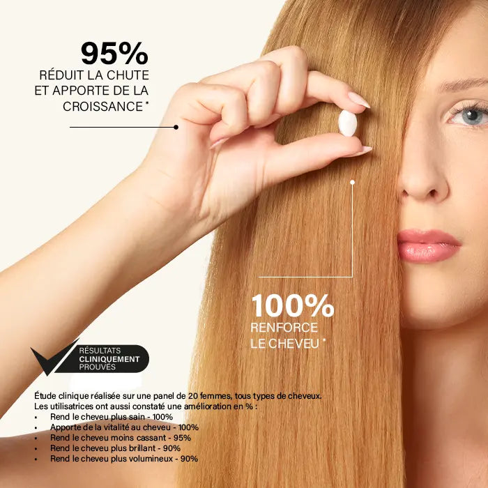 It is the most complete food supplement on the market ! It contains 18 vitamins, minerals and plants. It has a global action on the hair: strength, growth, fortification, anti-hair loss, health, vitality. Its effectiveness is clinically proven !